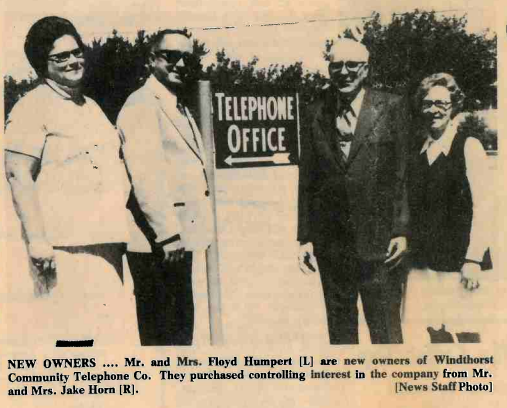 In 1948, V.N. (Red) Sears, an ex-Southwestern Bell employee, bought the franchise area from Holmes Telephone Co., of Wichita Falls, Texas. Holmes Telephone Co. was owned by J.N. (Jesse) Holmes, the father of Gordan Holmes, who was previously manager of the former Byers-Petrolia Telephone Company. He and his wife, Sara, named the phone company Community Telephone Company. They operated the business out of their house in Scotland, Texas until a large ice storm knocked down all of the lines. After this, they moved to Bluegrove, TX. Then they moved to Joy and operated the switchboard there until 1953, when they sold the company to Jake and Louise Horn. Jake Horn was employed by a mutually–owned phone company in Muenster, Texas. The Horns moved to Windthorst and moved the switchboard from the Eugene Anderle house to their house and operated it from there until 1958.